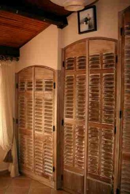 Pour l'intérieur nous posons des volets persienne, anciens ou réalisés avec l'aide d'anciens matériaux. Il confèrent une ambiance chaleureuse et occultent tout en permettant l'aération de vos placards.